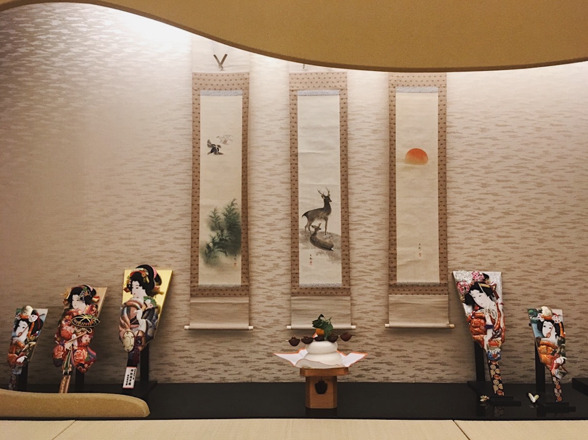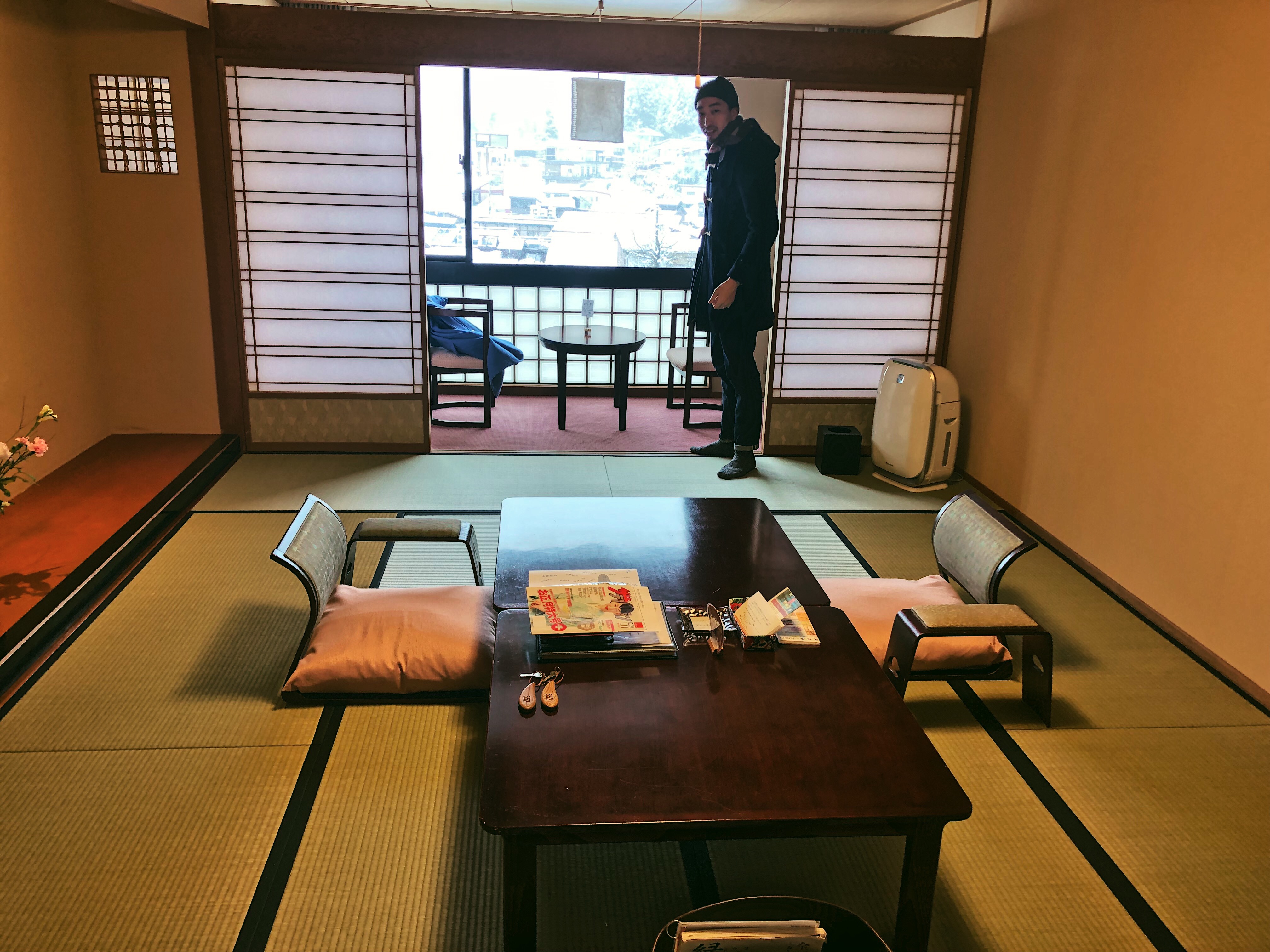 Upon arriving at the ryokan, we were greeted by a courteous staff member with a bow. He led us into the ryokan and invited us to remove our shoes. The ryokan had a large platform covered in tatami mats, on which shoes are not permitted. On the surrounding area of the tatami mat platform, nearest to the exit, was a shoe storage area. As soon as we took our shoes off to enter the tatami mats, the ryokan staff took our shoes and placed them in shoe shelves. On the other side of the tatami mat platform, the floor became carpet and right at the edge of the platform, there were slippers lined up for guests to wear around the hotel. A different hotel staff member, dressed in traditional Japanese wear, accompanied us into the elevator and up into our room. She politely showed us to our rooms and requested to know what time we would like to have dinner and go to the onsen, or hot spring, and once that was decided, she left us to settle in.