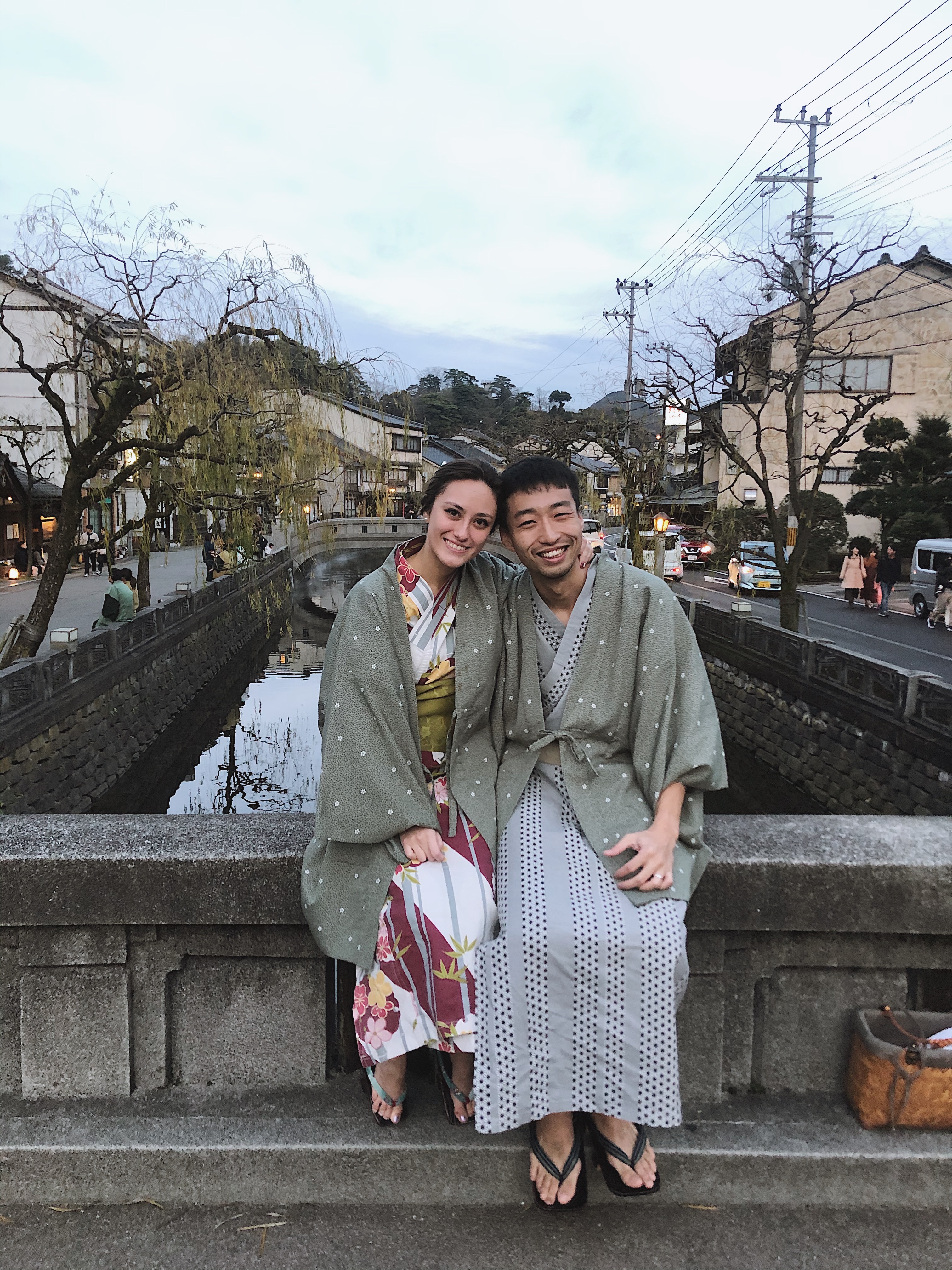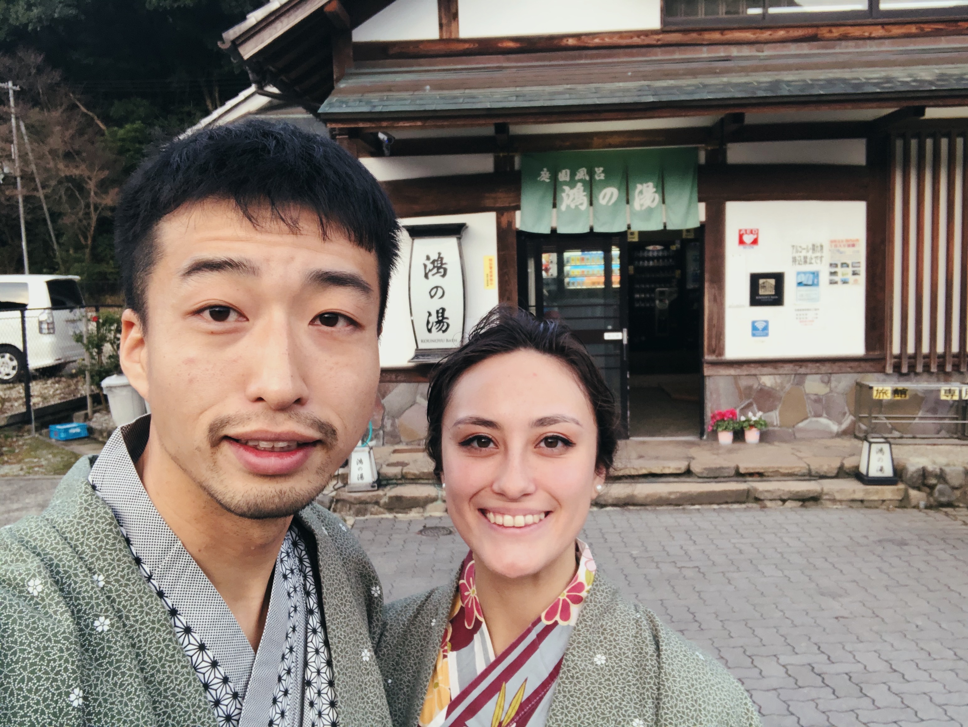 Once we were finally ready to head out, the hotel provided us with a nice basket with small and a large towel and a plastic bag for anything wet we might need to put inside of it. We headed out in our yukata and wooden geta, or traditional japanese sandals, which proved a bit difficult to walk in as I almost landed myself on the ground a few times. The hotel transported us to town in a van with another couple from the hotel and instructed us to call them when we were ready to get picked up.