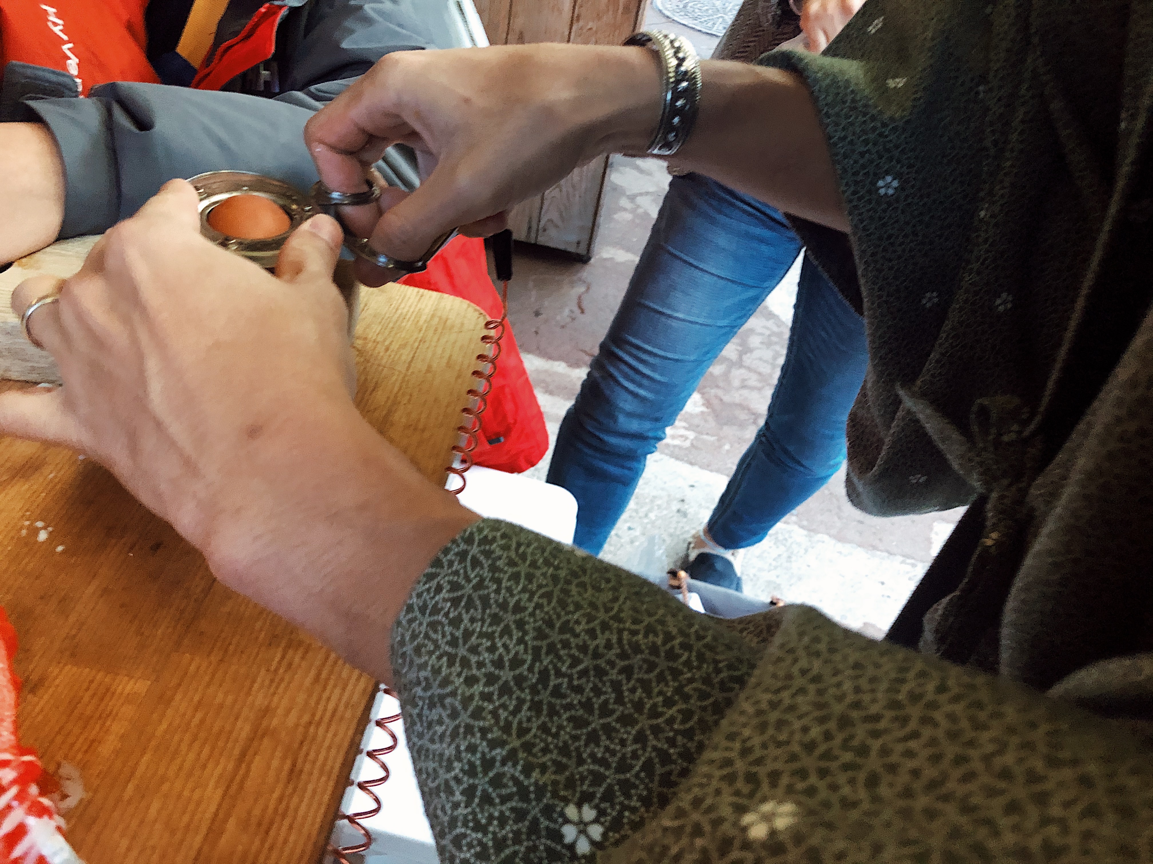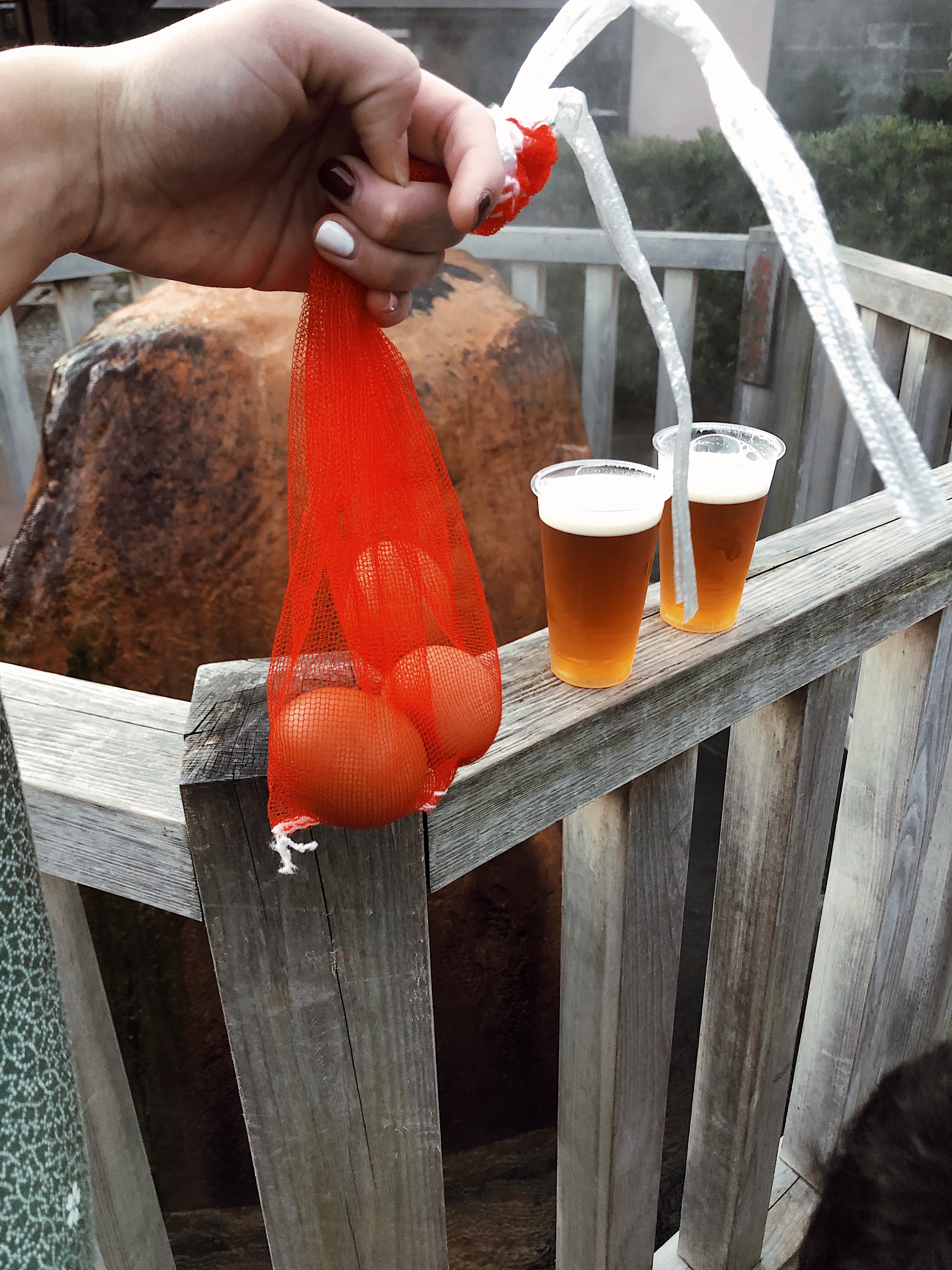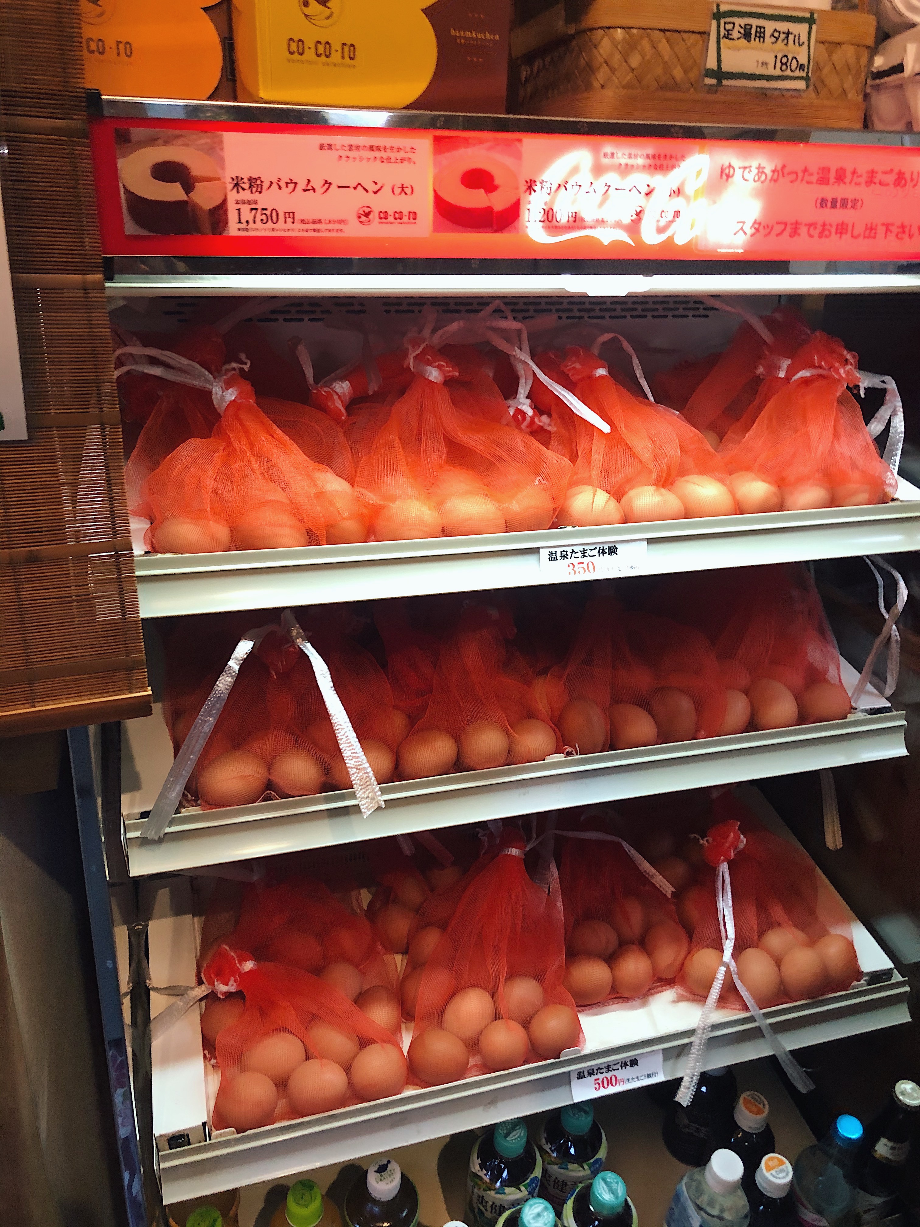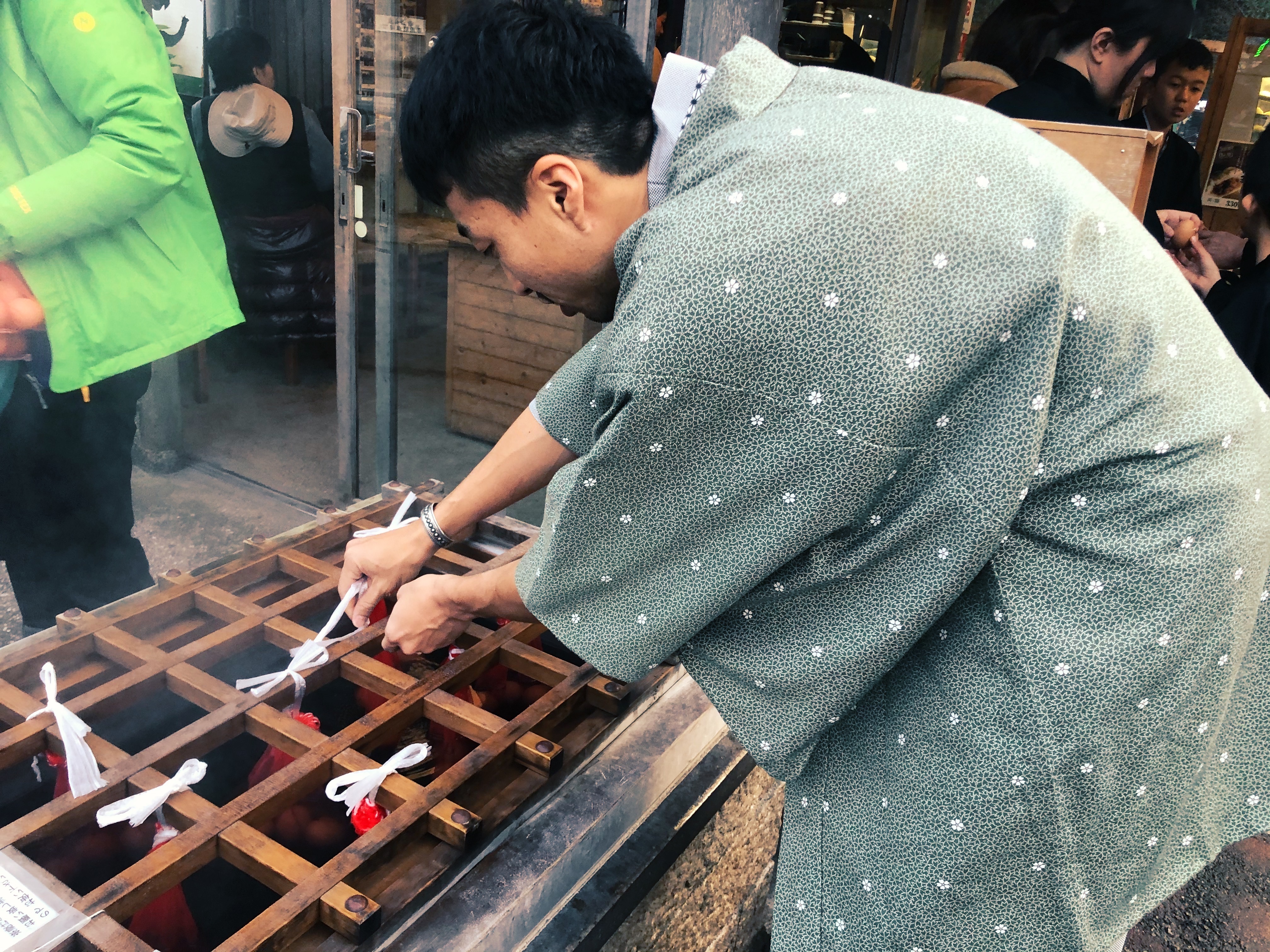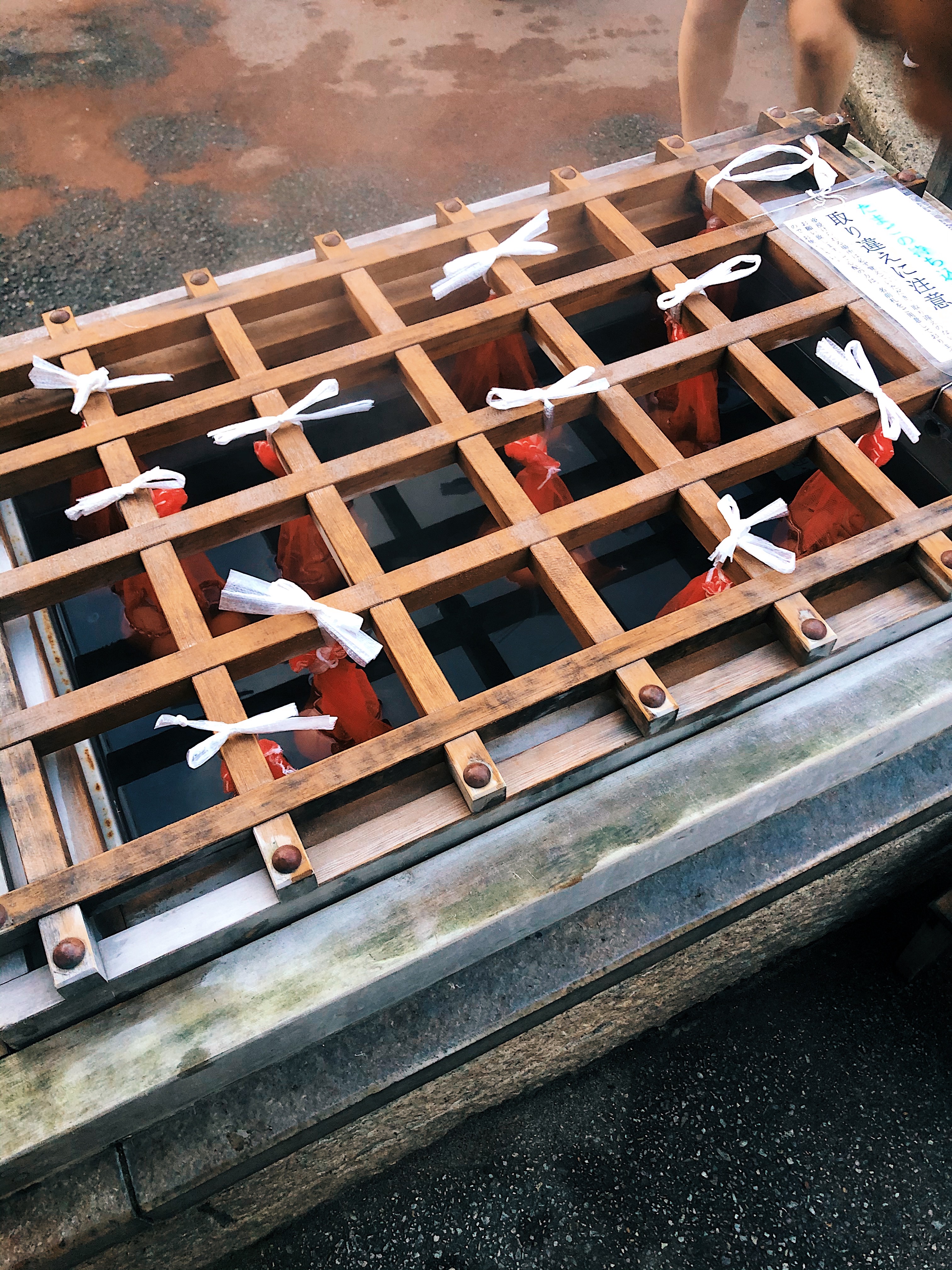 A really cool popular thing unique to the onsen experience is the onsen tamago, or hot spring egg. This is an egg that is a whole egg placed in a small hot spring for a few minutes until it cooks. While we walked around in between onsen, we stopped at a small store to buy our bag of three eggs. We then hung the bag from a wooden board (in picture below) and waited about 11 minutes for it to cook. In the meantime, we soaked our feet in a nearby footbath, which is a tiny hot spring for your feet. Once our eggs were ready, we used an instrument provided outside the store to pop off the top – it was a good thing the bag had three because we lost an egg to the ground trying to open it :(. We paired the egg with salt and a cold beer and it was simply delicious.